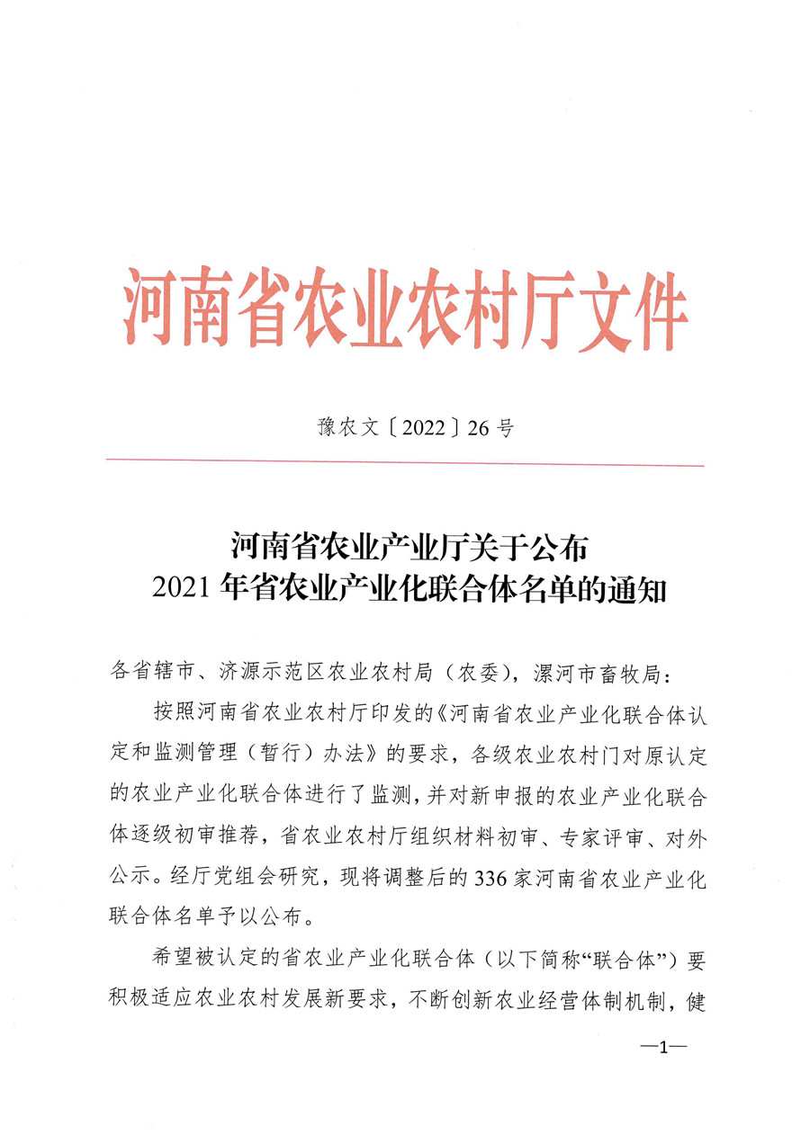 河南省農業農村廳關于公布2021年省農業產業化聯合體名單的通知